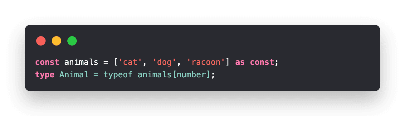 The typeof operator is used in conjunction with the number index to create a type alias called Animal. typeof animals refers to the type of the animals array, which is ['cat', 'dog', 'racoon'] (a tuple of string literals). By accessing the number index, typeof animals[number] represents the union of all possible values in the animals array, i.e., 'cat' | 'dog' | 'racoon'.